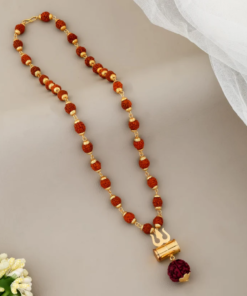This Authentic 5 Mukhi Rudraksha Shiv Trishakti Pendant Necklace is a spiritually powerful and beautifully handcrafted piece inspired by Lord Shiva. The necklace features natural Rudraksha beads strung together with golden-toned spacers, creating a traditional yet elegant look. At the center hangs a sacred Shiva Trishul (Trident) and Damru (Divine Drum) symbol, representing protection, balance, and cosmic energy.