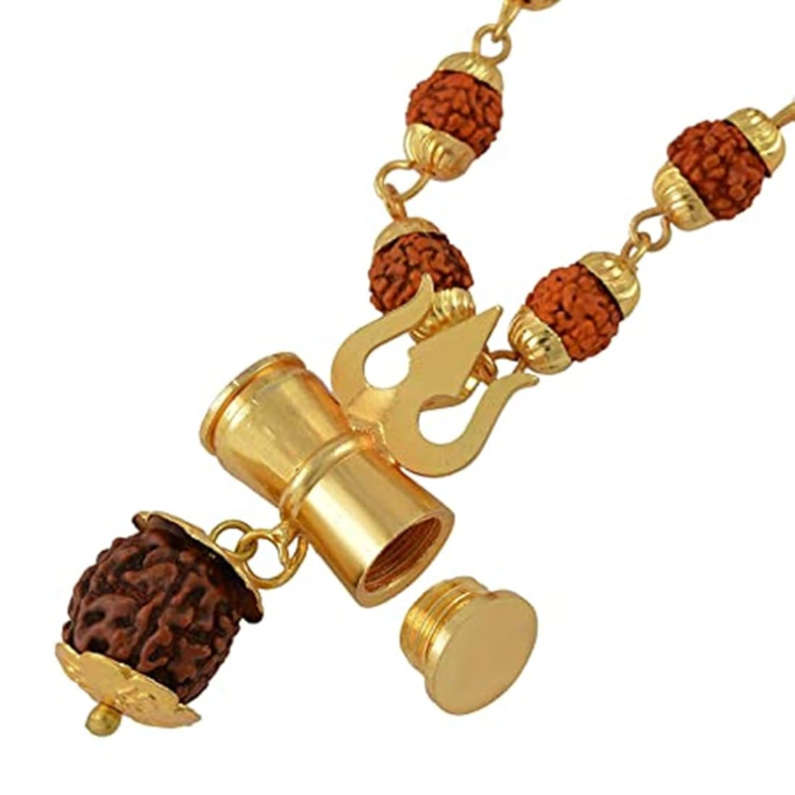Below the Trishakti symbol is a genuine 5 Mukhi Rudraksha, carefully capped to enhance durability and appearance. The warm earthy tones of the Rudraksha combined with the golden finish give this necklace a divine and devotional presence, making it suitable for daily wear, meditation, or religious occasions.