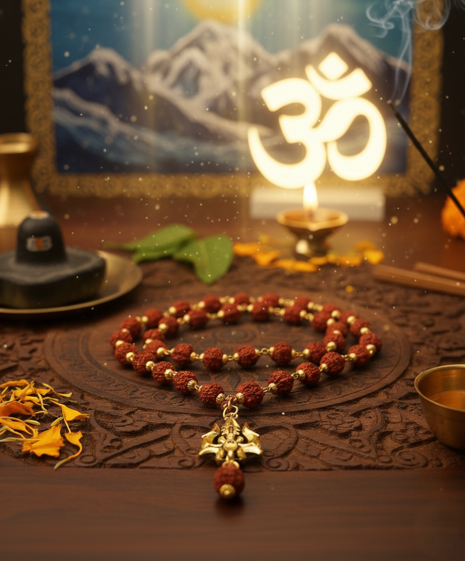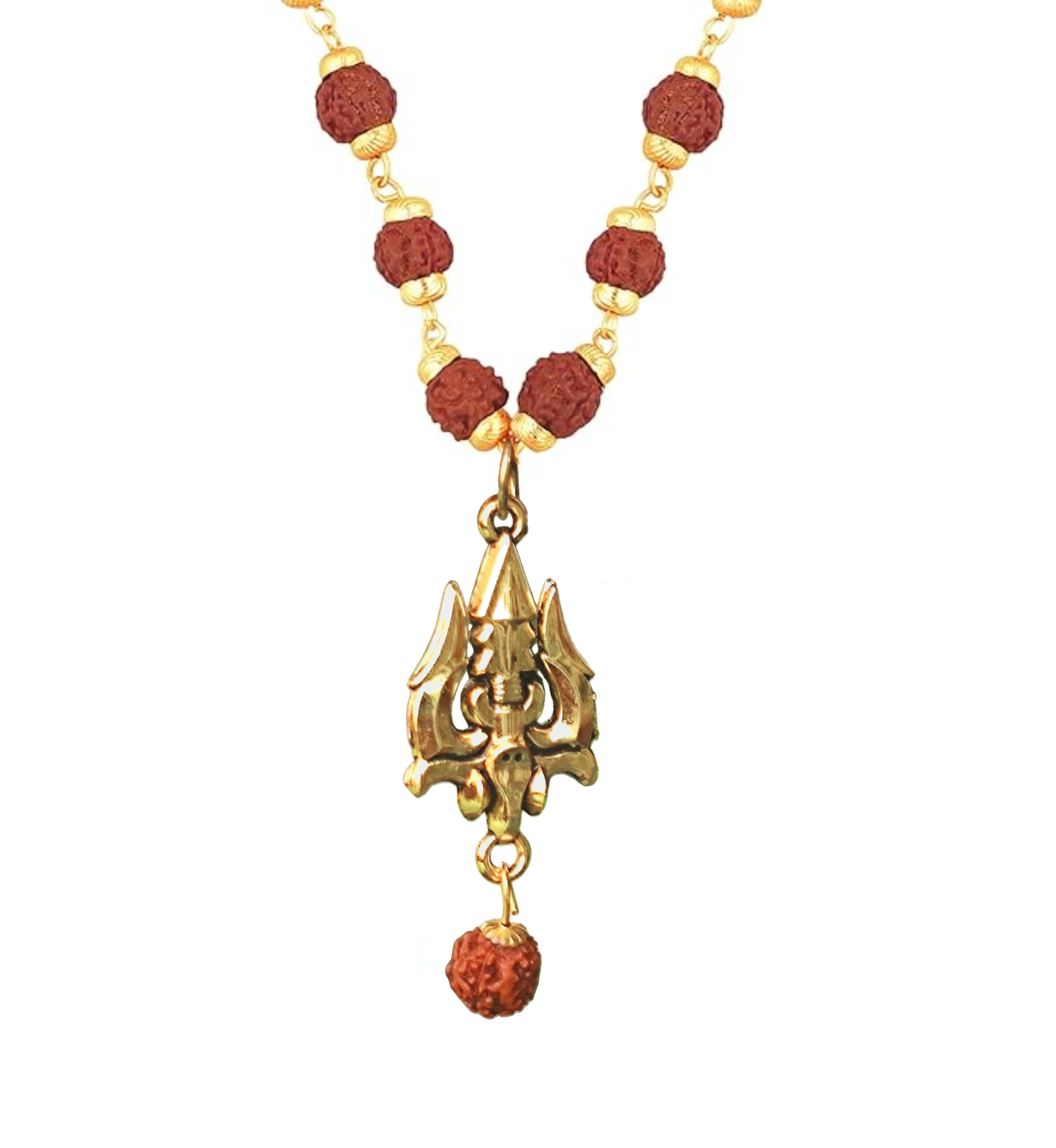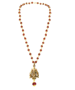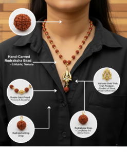 This Authentic 5 Mukhi Rudraksha Shiv Trishul Pendant Necklace is a powerful spiritual ornament inspired by the divine symbolism of Lord Shiva. The necklace is crafted with natural Rudraksha beads, elegantly linked with gold-tone spacers that enhance its traditional and premium appearance.