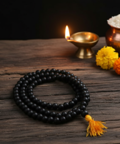 This mala is a traditional spiritual tool crafted from Karungali (Black Ebony Wood), highly revered in South Indian traditions for its intense grounding properties and association with protective energies.