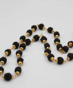 A perfect blend of traditional spirituality and contemporary fashion, high-quality 5 Mukhi beads paired with a bold gold-plated curb chain. The design features the sacred beads at the front and back, seamlessly transitioning into a polished gold-toned link chain for a modern, heavy-duty look. Equipped with a secure S-hook clasp, this versatile piece is designed to be worn by both men and women who appreciate artisanal craftsmanship.