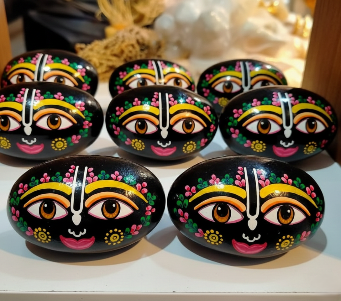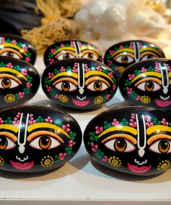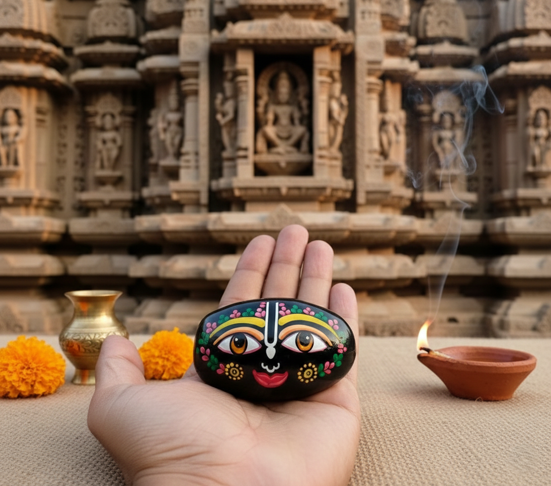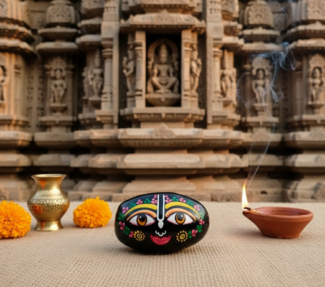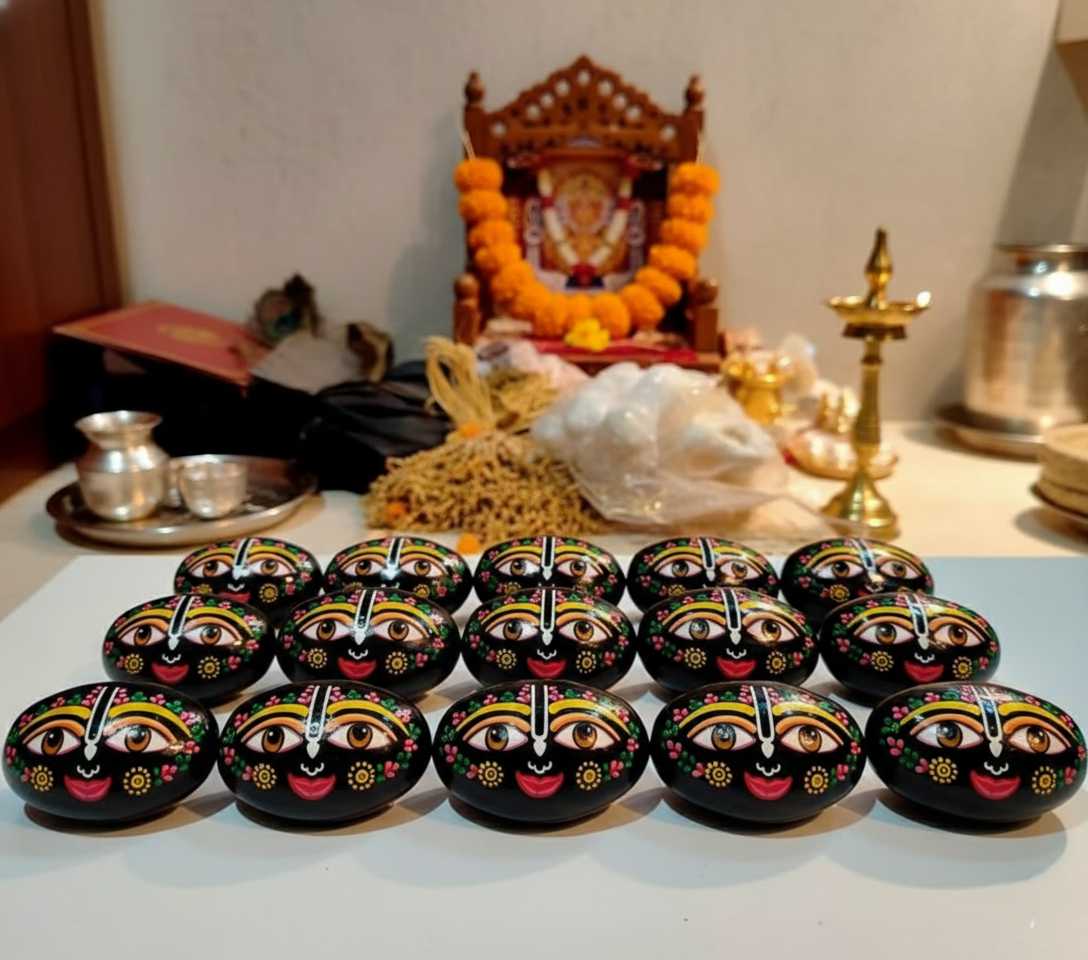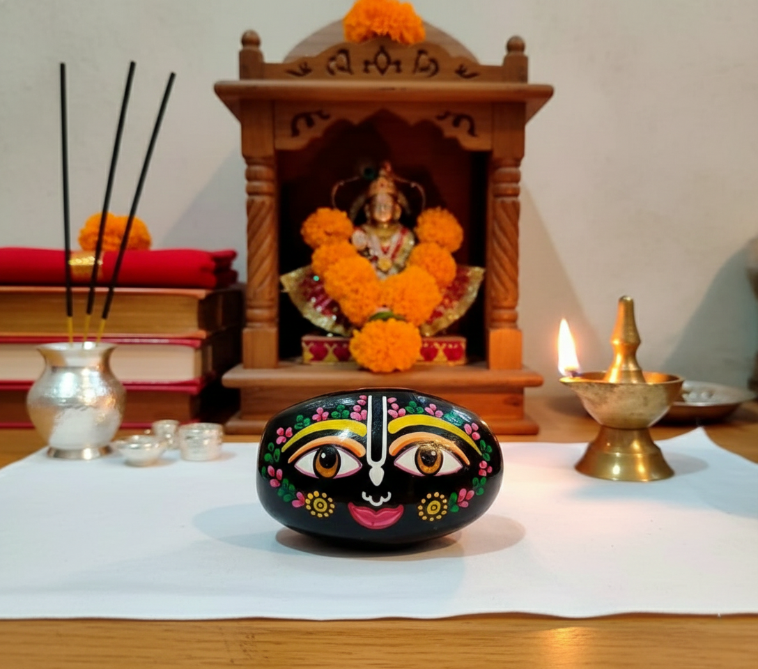 Symbolism: The deep black hue of the stone represents the infinite nature of the cosmos, while the painted face brings the “Lord of the Universe” (Jagannath) into a tangible form for worship (Puja).