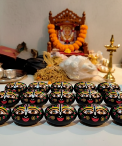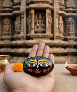 Artisanal Craftsmanship: Each stone features intricate hand-painted iconography, including the iconic large, round “Lotus Eyes,” the Urdhva Pundra (tilak), and vibrant floral patterns that reflect the traditional art of Puri.