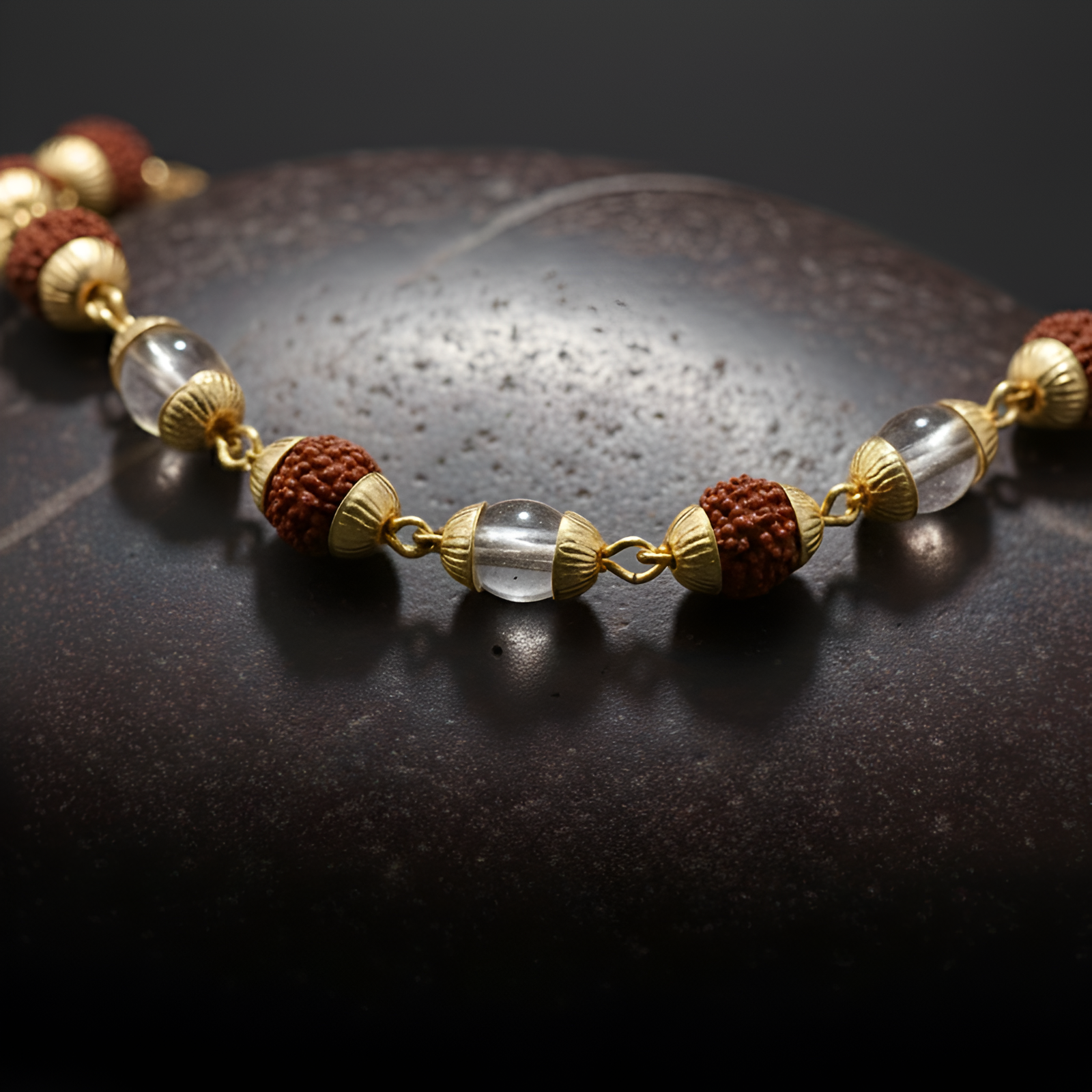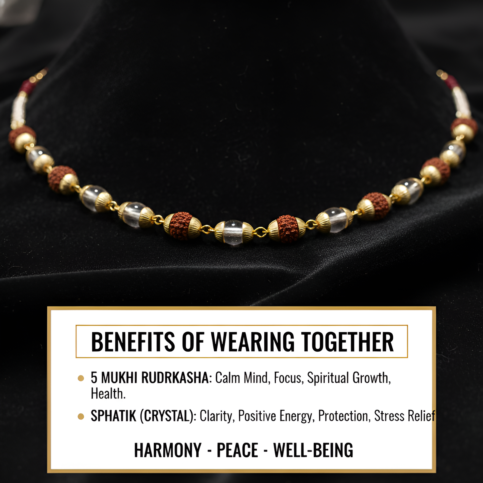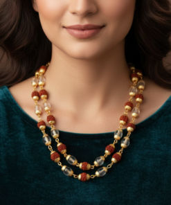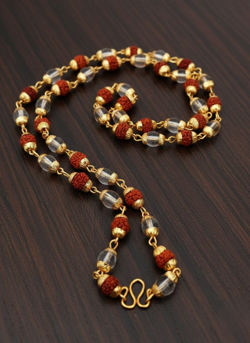 Materials: Natural Rudraksha, Sphatik (Quartz), and Gold-Plated Alloy.