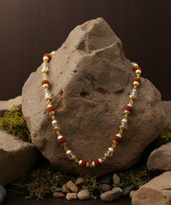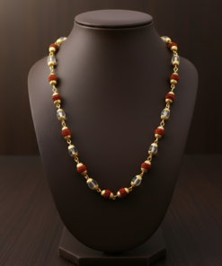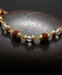 This powerful spiritual accessory combines the grounding energy of natural Rudraksha beads with the cooling, purifying properties of Sphatik (Quartz Crystal). Each bead is thoughtfully encased in high-quality gold-plated caps, creating a harmonious and aesthetically pleasing “mala” that balances traditional values with a touch of luxury.
