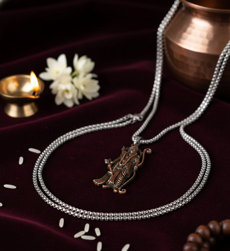 Carry the blessing of the Seventh Avatar of Lord Vishnu with this exquisitely crafted Lord Ram Pendant. This piece captures the “Kodanda Rama” form, depicting the Divine King with his iconic bow and arrow, symbolizing the protection of Dharma and the triumph of good over evil.