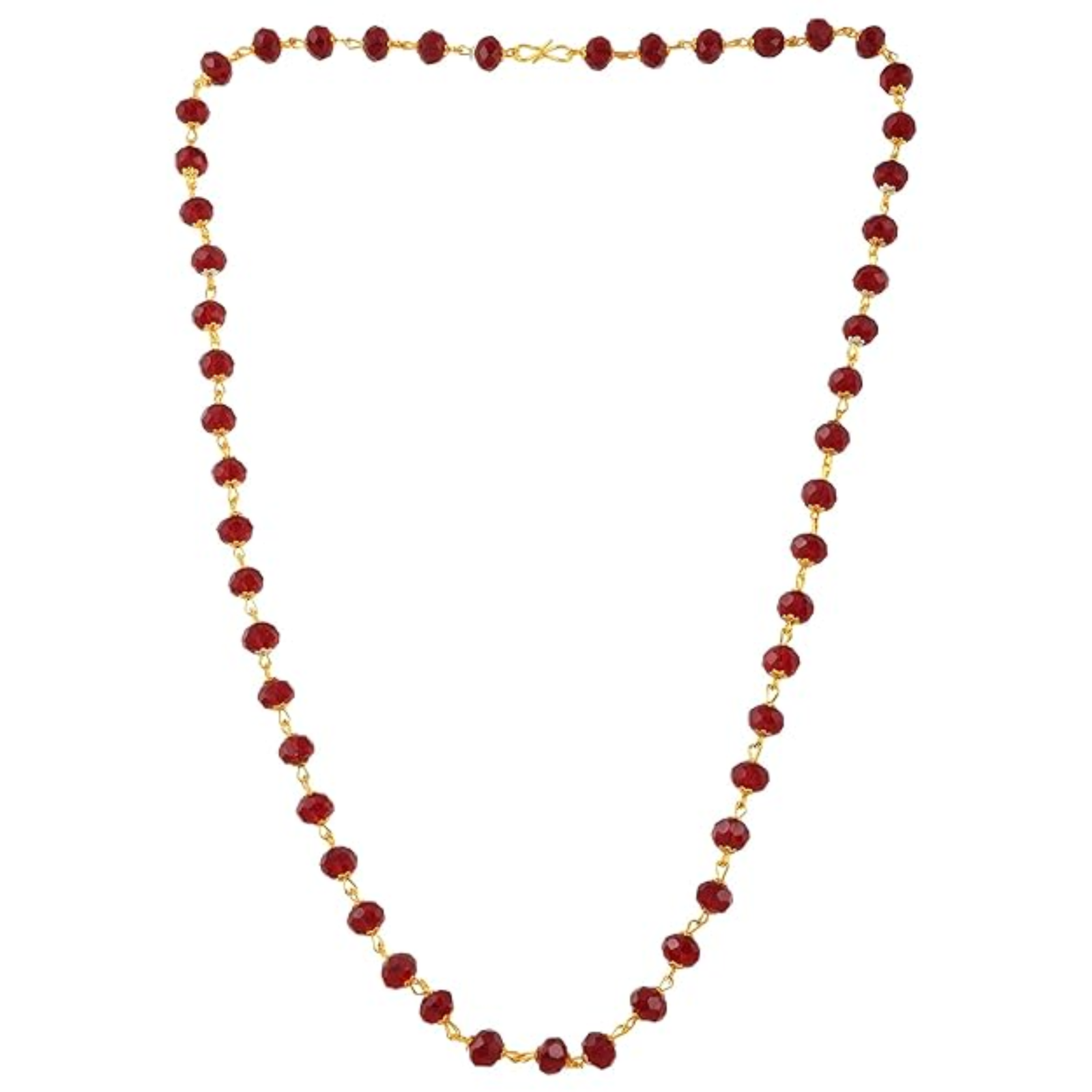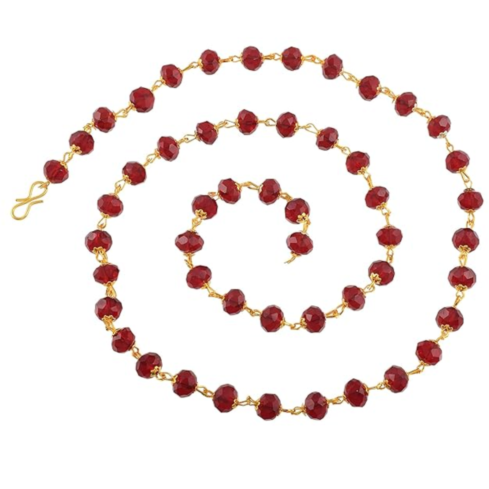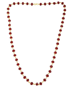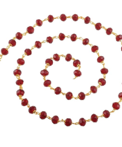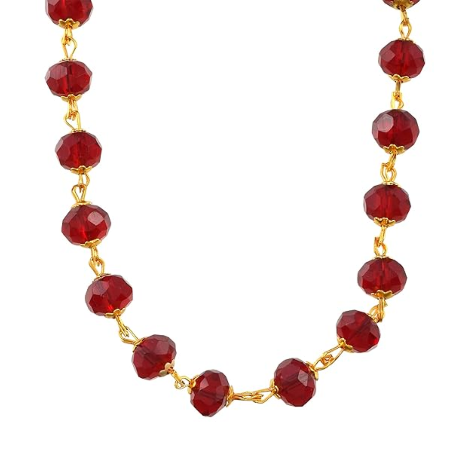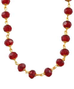 This exquisite necklace features a classic, vibrant design centered around high-quality faceted maroon crystal beads. Each bead is meticulously linked with a gold-plated wire-wrap technique, creating a continuous, fluid chain that catches the light from every angle. The deep red hue of the crystals offers a striking contrast against the polished gold finish, making it a sophisticated accessory for both traditional and contemporary outfits.