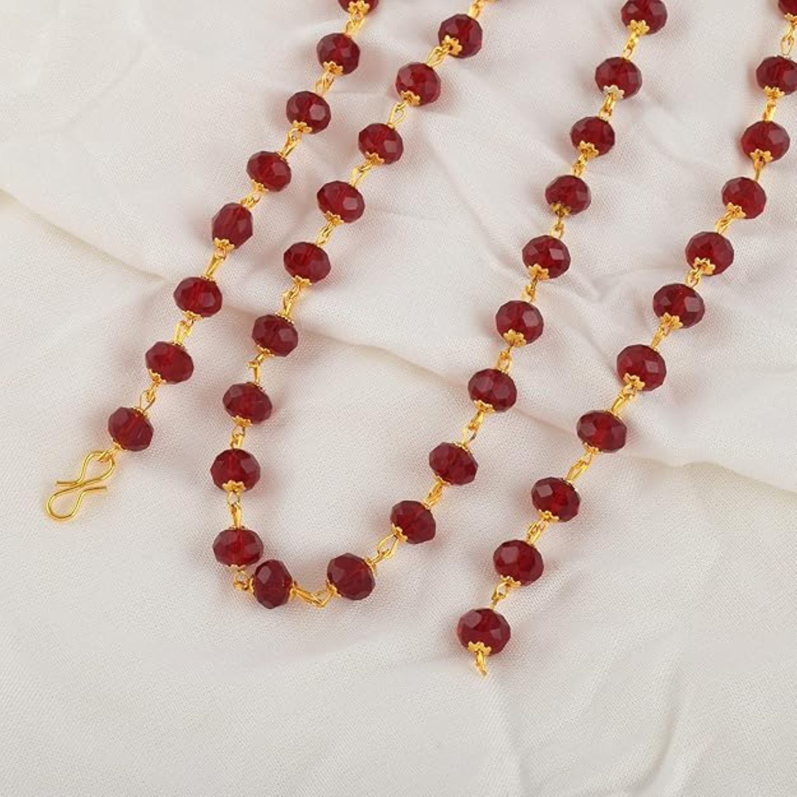 Beads: Premium faceted crystals in a rich maroon/ruby shade, designed for maximum sparkle and durability.