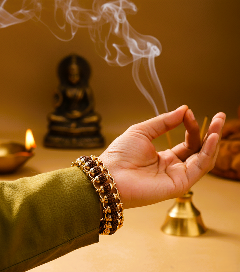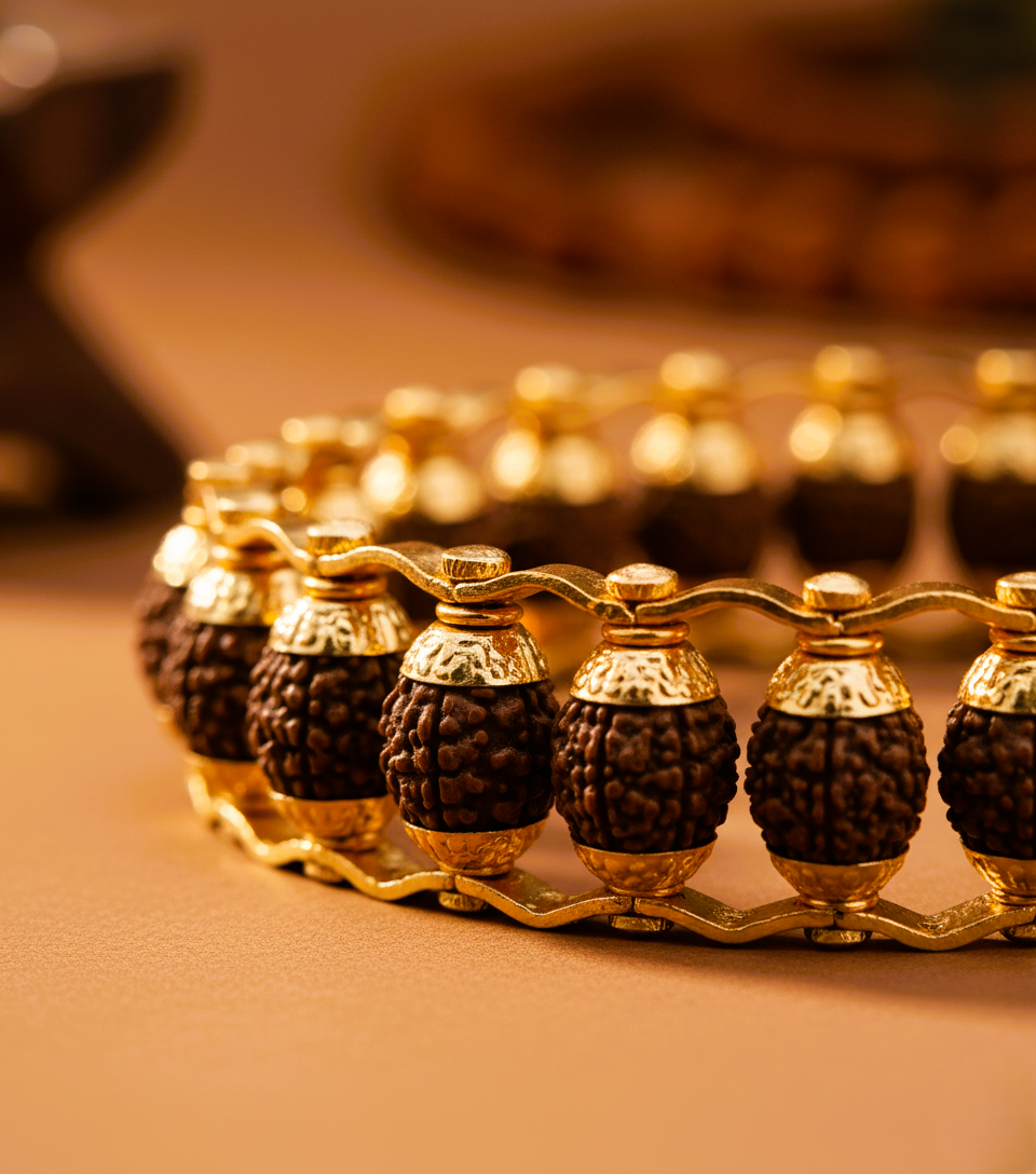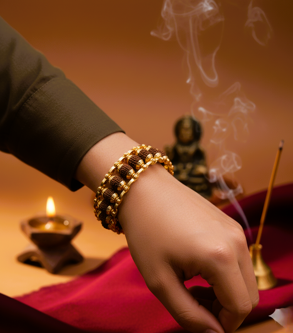 This gold-plated 5 Mukhi Rudraksha bracelet is a refined blend of spiritual tradition and contemporary design. Crafted with carefully selected five-faced Rudraksha beads, the bracelet showcases the natural texture and symmetry that distinguish authentic 5 Mukhi Rudraksha.