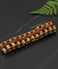 Each bead is securely set in a polished gold-plated casing and connected through a flexible link structure, ensuring both durability and comfortable wear. The warm gold tone enhances the deep, earthy brown of the Rudraksha, creating a balanced and sophisticated look suitable for daily use or special occasions.