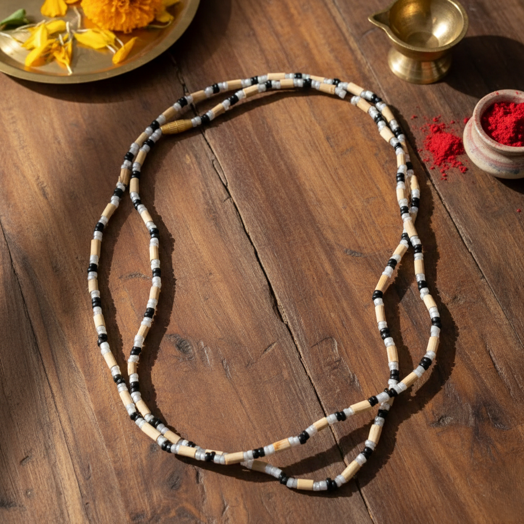 Spiritual Benefits: Traditionally worn by devotees to promote peace of mind, protection, and to harmonize the body’s energy. It is considered an essential accessory for practitioners of Bhakti Yoga and meditation.