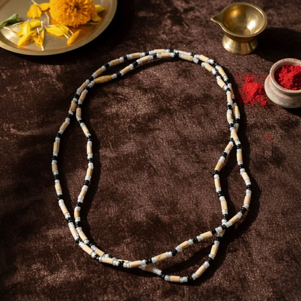 Intricate Beadwork: Each strand showcases a rhythmic pattern of cylindrical and round cream-colored beads, accented by dark ebony or black-stained beads for a striking contrast.
