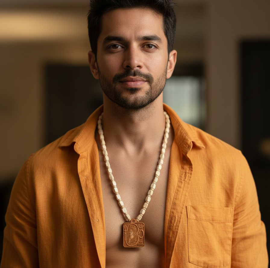 Elevate your spiritual journey and personal style with this masterfully crafted devotional necklace. This piece combines the purity of sacred Tulsi wood with the powerful symbolism of Lord Shiva, creating a wearable piece of art that resonates with faith and tradition.