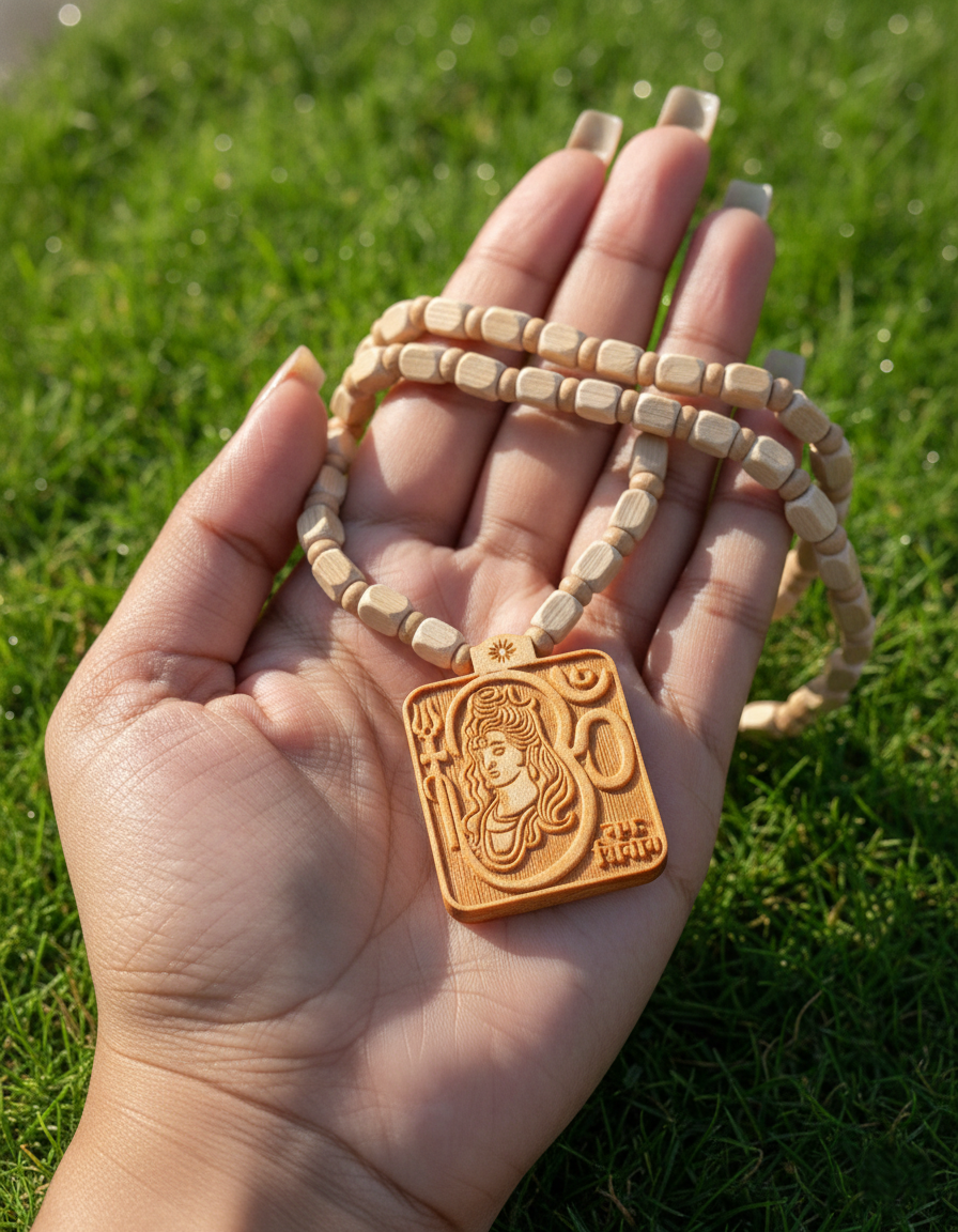 Intricate Locket Craftsmanship: The centerpiece is a beautifully rectangular wooden locket, hand-carved with a detailed depiction of Lord Shiva. The carving features the iconic Trishul (trident) and the sacred “Om” symbol, representing the source of all existence.