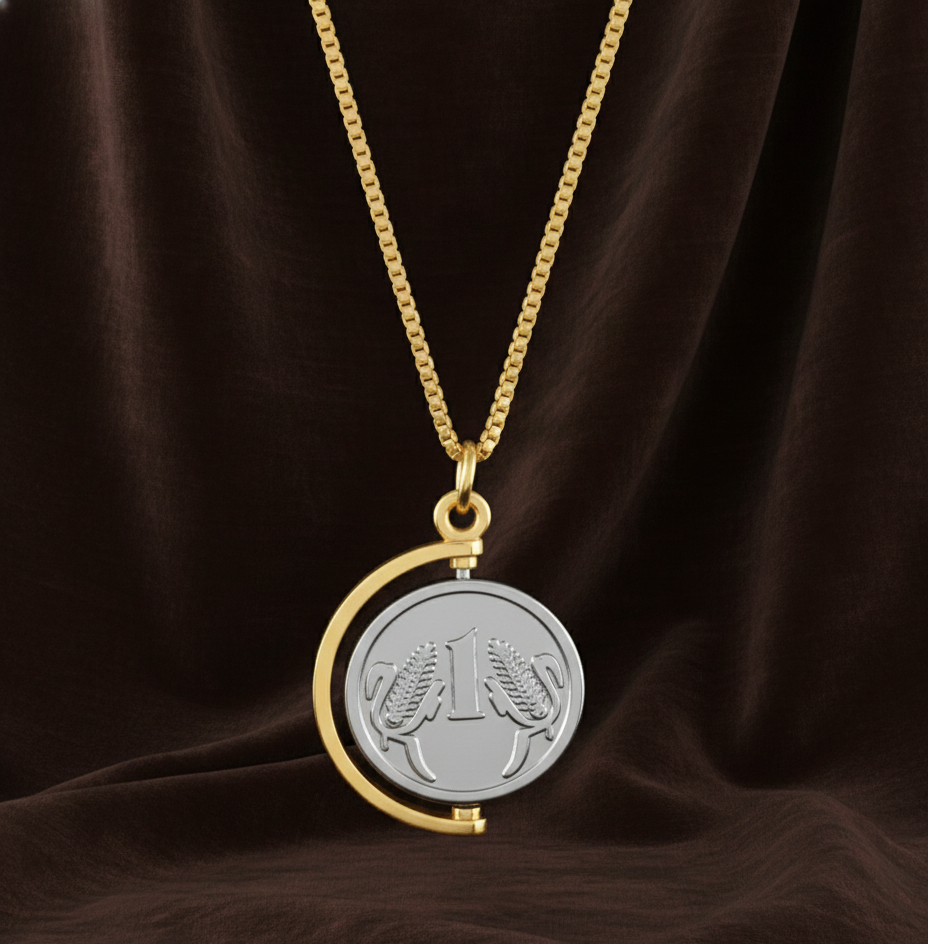 This unique piece of jewelry features an authentic Indian 1 Rupee coin reimagined as a dynamic, interactive pendant. The coin, notable for its iconic wheat stalk design signifying prosperity, is set within a specialized rotatable gimbal frame that allows it to spin freely.