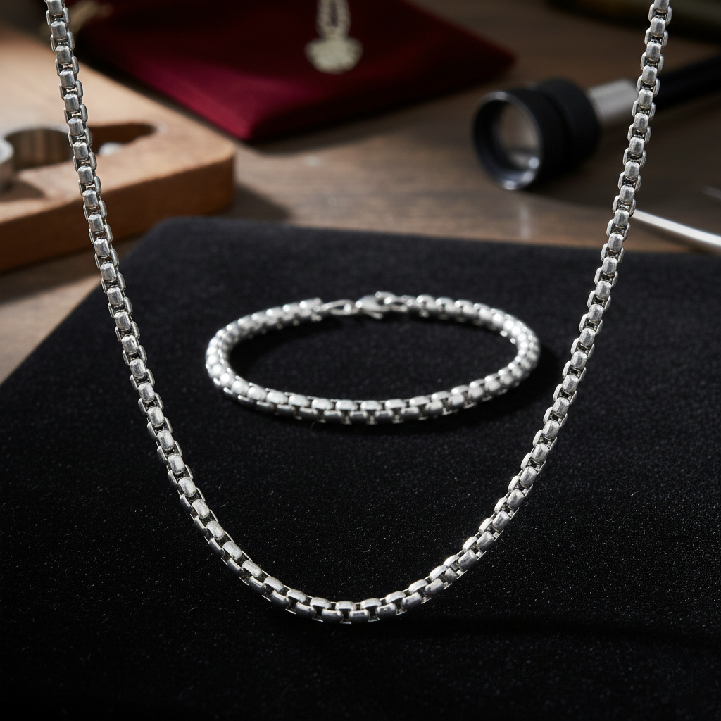 Cohesive Styling: Includes a matching neck chain and a sleek wrist bracelet, both featuring the iconic, geometric box link design for a unified aesthetic.