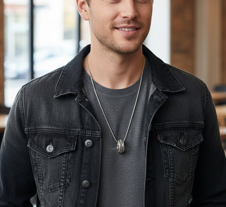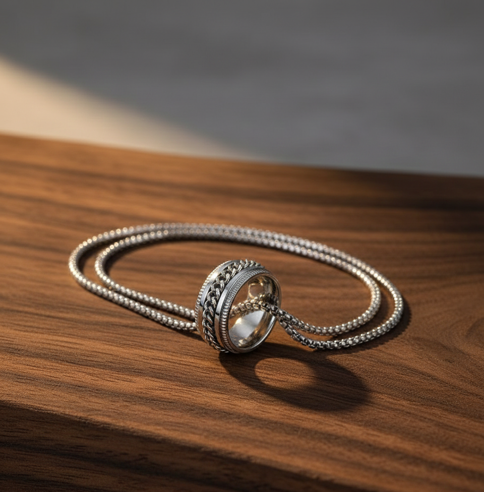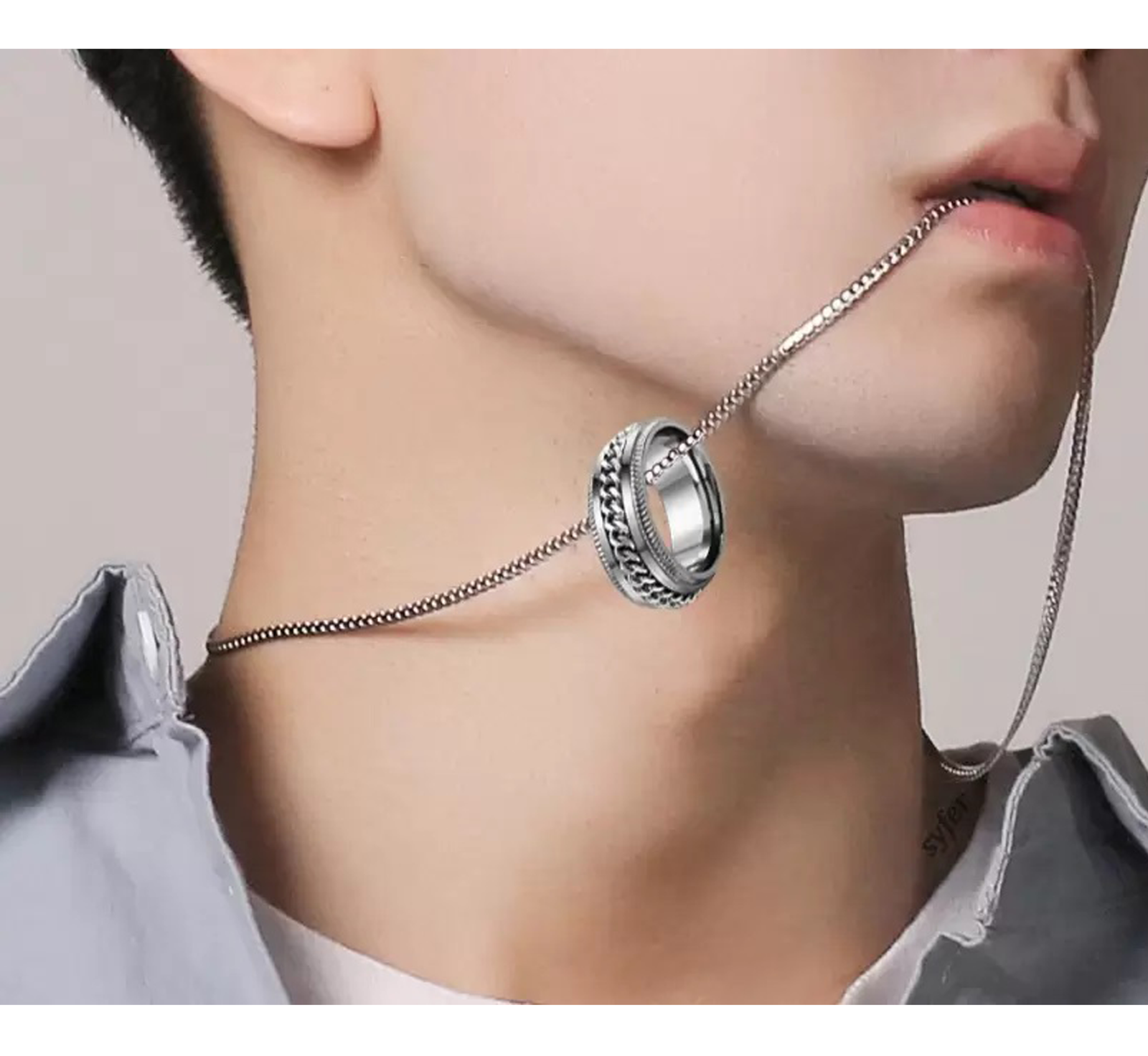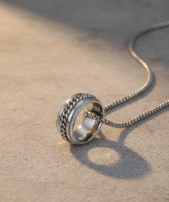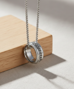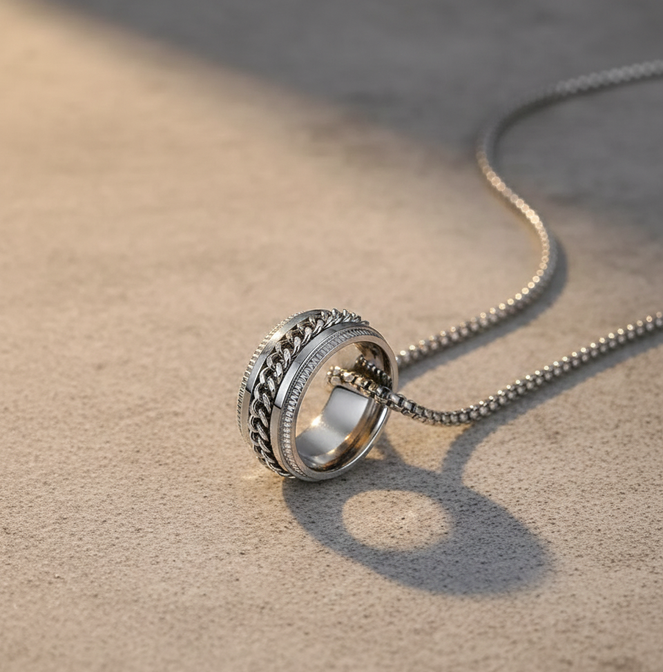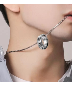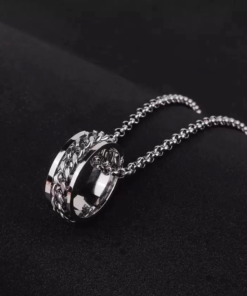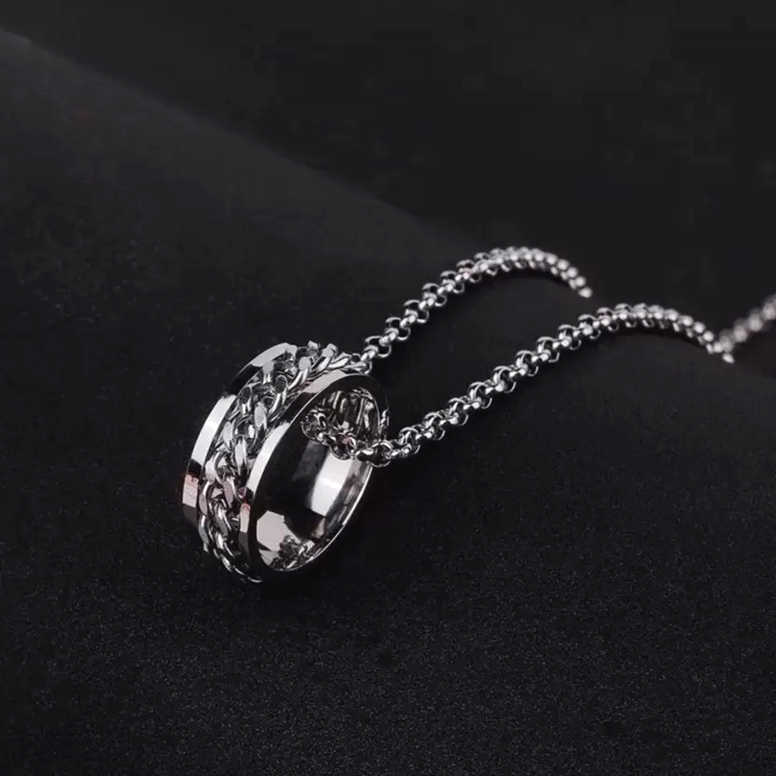 Elevate your everyday style with this industrial-inspired pendant necklace. Crafted from high-grade, surgical stainless steel, the centerpiece features a unique rotatable Cuban link inlay set within a polished outer band. Designed for the modern man, it hangs from a durable 24-inch box chain that offers both comfort and a heavy-duty feel. Whether worn over a basic tee or tucked under a button-down, it’s a versatile piece built to withstand the elements without tarnishing.