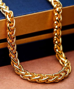 Gold-Tone Wheat Chain: A sophisticated gold-plated wheat chain (also known as a Spiga chain) with a complex, braided texture that provides a rich, woven appearance.