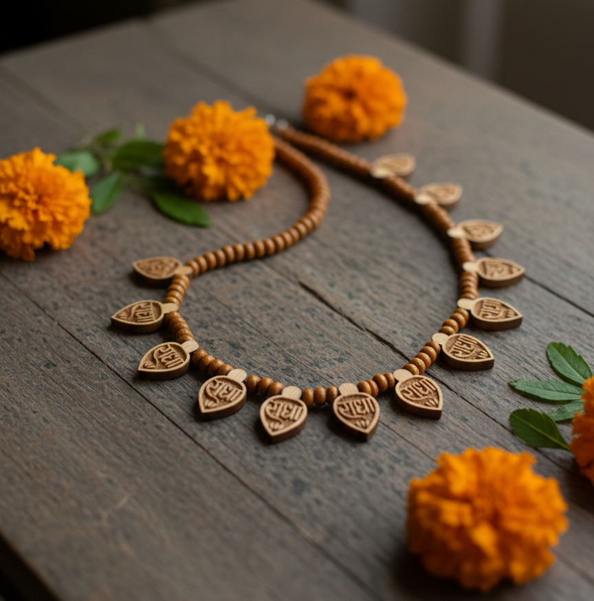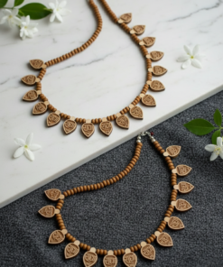 Embrace spiritual elegance with this exquisite handcrafted necklace, featuring 16 intricately carved sandalwood leaves. Each leaf is delicately engraved with the sacred name “Radha” in Hindi script, symbolizing devotion and divine love.