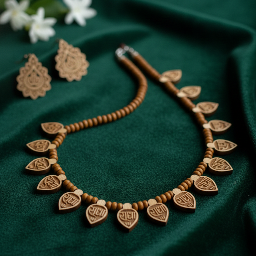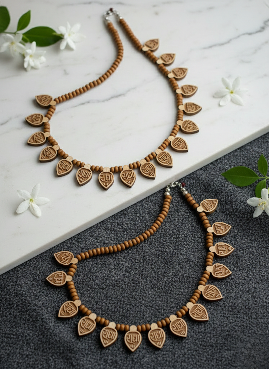 The necklace is meticulously strung with smooth, aromatic sandalwood beads, designed to sit gracefully near the throat as a short choker. The warm, earthy tones of the natural wood paired with the traditional leaf-drop design make it a perfect accessory for ethnic wear or spiritual gatherings.