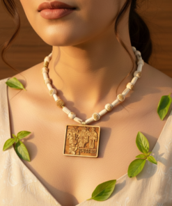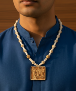 The centerpiece is a beautifully detailed, rectangular wooden pendant featuring the Ram Darbar—Lord Ram, Sita Mata, Lakshman, and Hanuman—symbolizing protection, righteousness, and devotion. Designed to be worn close to the skin, this mala combines the purifying properties of Tulsi with the powerful vibrations of the “Ram” name.