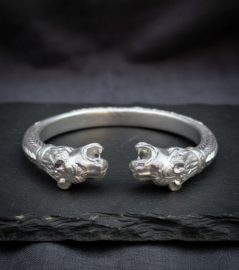 Majestic Lion Finials: The ends of the kada are sculpted into two highly detailed lion heads facing each other. In many spiritual traditions, the lion symbolizes courage, protection, and sovereignty, acting as a guardian for the wearer.