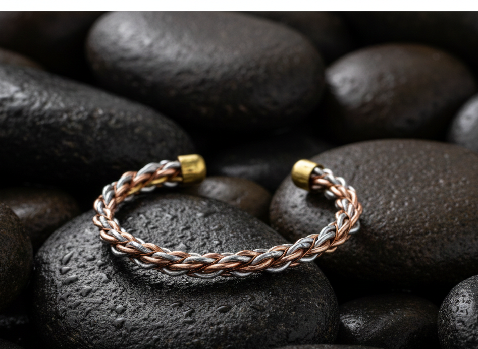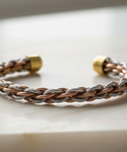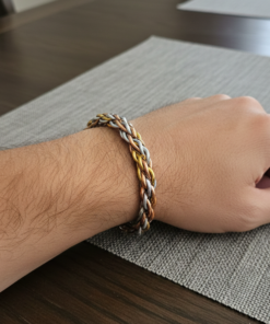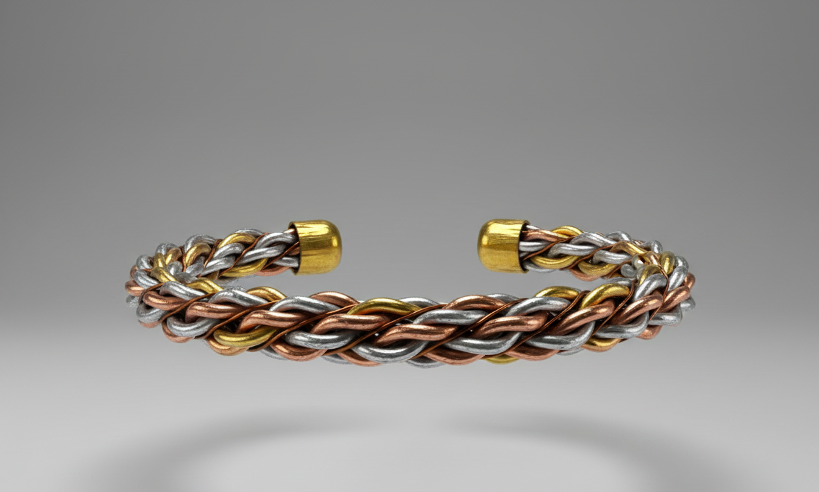 Elevate your daily ensemble with this meticulously crafted braided cuff bracelet. Designed to balance style and wellness, this “Kada” features a sophisticated interwoven pattern using three distinct metallic tones. The open-cuff design ensures a comfortable, adjustable fit for both men and women, while the integrated magnets at the terminals provide a functional touch of magnetic therapy.
