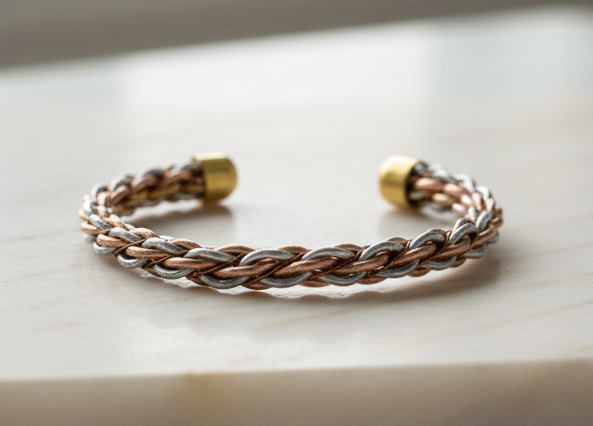 Artisanal Braided Design: Features a complex, three-strand interlocking weave that creates a beautiful infinity-loop texture around the wrist.